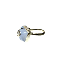 A handcrafted silver ring featuring a faceted pale chalcedony stone set in a bold, geometric frame.